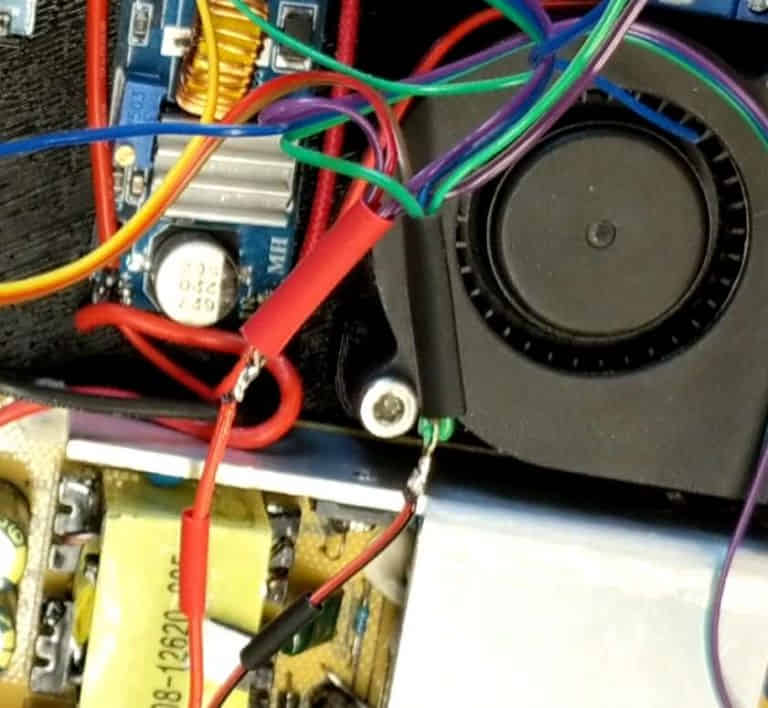 Souder les fils de la sortie du power supply 12 volts avec les fils du ventilateur à l’entrer du convertisseur DC. Faites attention de bien respecter la polarité (+ / – ).